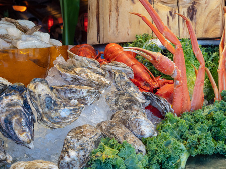 Raw crab legs, shrimps and oysters on ice in seafood restaurant