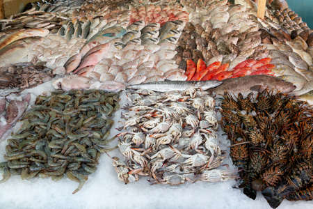 Fresh fish on display on ice on fishermen market store shop. Seafood fish, shrimp, blue crab, fresh fish. Seafood fish background. Top view