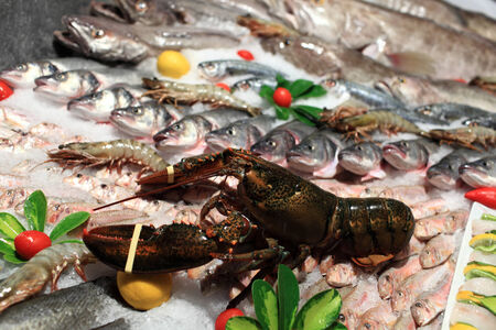 Lobster and fish lie on ice in the display fridge