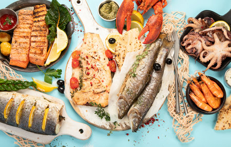 Assortment various barbecue Mediterranean grill food - fish, octopus, shrimp, crab, seafood, mussels, summer diet bbq party fest, with kebab, sauces, light blue sunne wooden background
