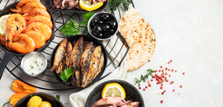 Seafood platter. Assorted delicious seafood with vegetables on a gray background. top view. Panorama with copy space.