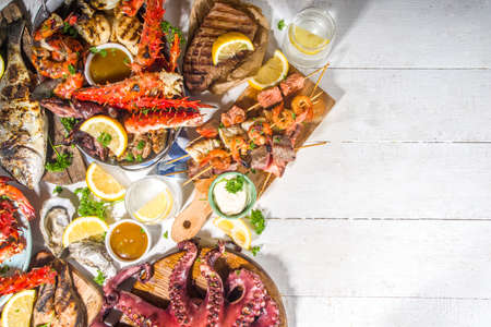 Assortment various barbecue Mediterranean grill food - fish, octopus, shrimp, crab, seafood, mussels, summer diet bbq party fest, with kebab, sauces, white wooden background, above copy space