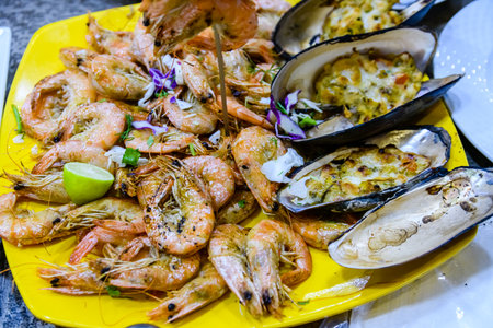 seafood plate with shrimp shellfish crab squid cockle spotted babylon with seafood sauce chili lemon lime serve on dining table, shrimps prawns seafood buffet menu cooked food