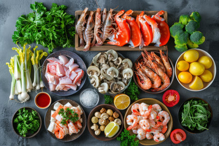 Gathering of seafood and fresh ingredients on a dark table for meal preparation