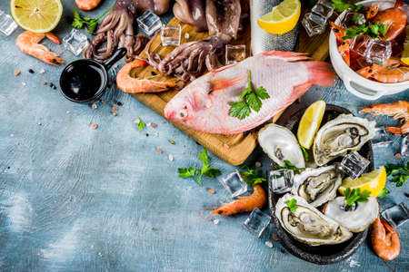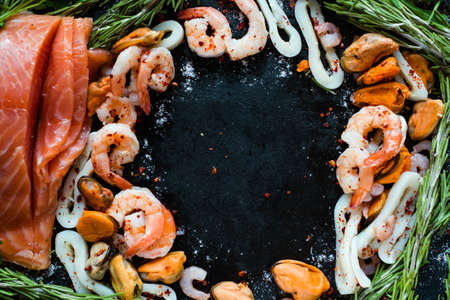 Fresh raw seafood. Healthy diet eating concept. Top view with copy space