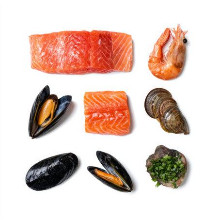 A visually appealing arrangement of fresh seafood including salmon, shrimp, mussels, and clams, garnished for an elegant presentation. Perfect for culinary projects.