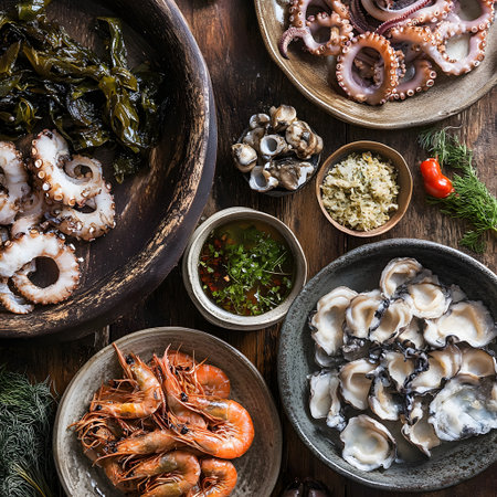 A captivating seafood platter showcasing an array of fresh shrimp, scallops, and squid, garnished with herbs and served with vibrant sauces.