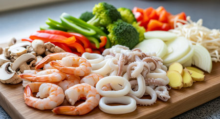 Seafood and Vegetables on wooden cutting board - Healthy food style