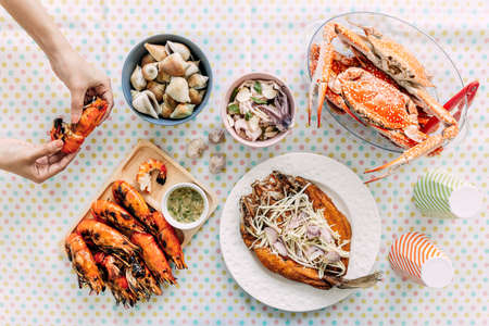 Top view of Thai Seafoods are Grilled Prawns (Shrimps) in the shell, Steamed crabs, grilled Laevistrombus Canarium, Grilled Squid and Deep Fried Sea Bass with Sweet Fish Sauce and Mango Salad.