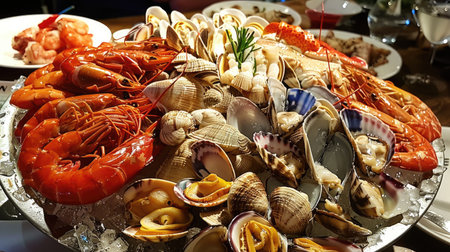 Ocean-inspired seafood platter with an assortment of oysters, shrimp, and crab, set against a seashell decor.. AI generated.