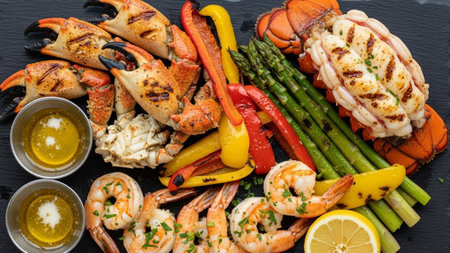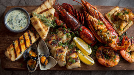 A stunning seafood platter featuring succulent lobster, shrimp, and grilled fish, garnished with fresh herbs and lemon on a rustic wooden board, perfect for sharing.