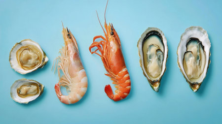 Stunning arrangement of fresh seafood featuring shrimps and oysters on a vibrant blue background, perfect for culinary projects and food photography. Ideal for gourmet themes.