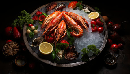 A vibrant arrangement featuring fresh seafood including lobster and prawns, garnished with herbs and sliced lemons on a bed of ice. perfect for culinary arts, restaurant menus, or seafood promotions. Generative AI