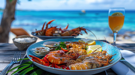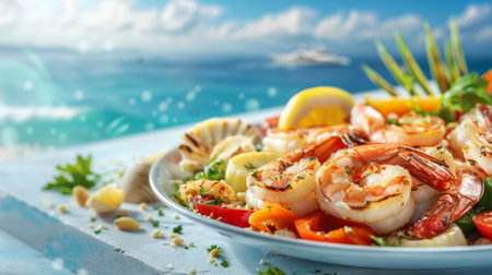 A vibrant dish of grilled seafood overlooking a tropical sea, offering a feast for the eyes and palate alike