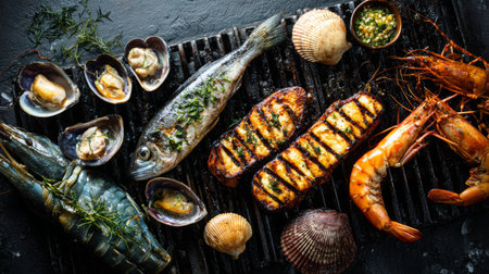 A visually appealing seafood arrangement featuring shrimp, fish, and shellfish on a grill. Fresh lemon slices and aromatic herbs enhance the culinary display, creating an enticing preparation scene for an unforgettable meal.