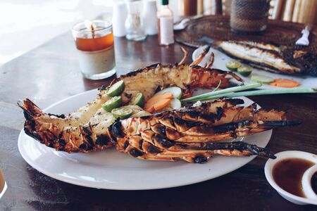 Tasty fresh lobster served at a restaurant Boracay, Philippines, served with vegetables on decorated plate.