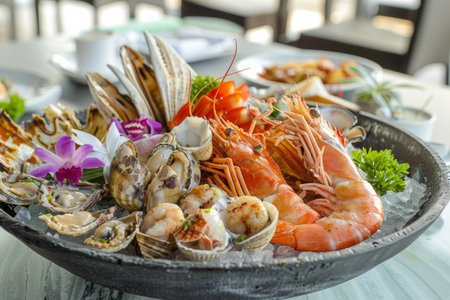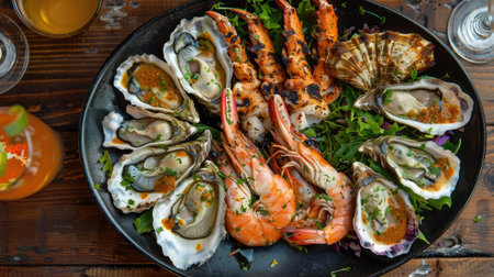A visually appealing seafood platter featuring shrimp, lobster, and oysters, garnished with fresh herbs and citrus. Ideal for showcasing culinary delights and vibrant dining experiences.