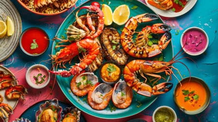 Delicious Seafood Platter of Grilled Fish, Shrimp, and Shellfish with Lemon slices and sauces. top view.
