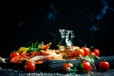 Ingredients for the preparation black pasta with seafood, tomatoes and wine, black background, selective focus