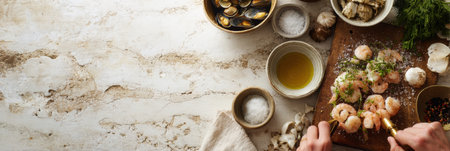 Fresh seafood arrangement on light background. Mediterranean diet concept. Flat lay, top view