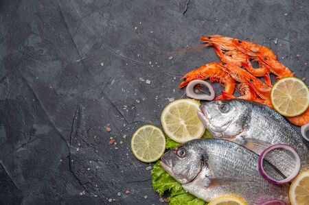 Fresh dorado fishes and shrimps on bord prepared to cooking, vegetables and fresh sea food. Cooking background, flat lay