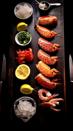 A stunning overhead shot showcases a luxurious seafood platter featuring succulent shrimp, tuna sashimi, and other delicacies, accompanied by various appetizers.