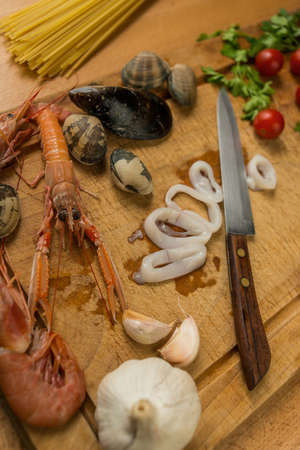Ingredients for making seafood lying on a wooden table next to the empty pan ..