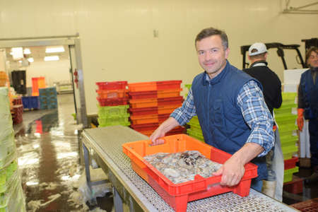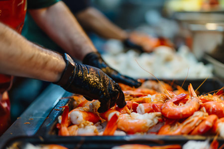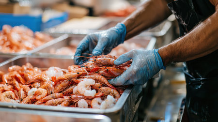 A Fresh seafood sorting in distribution center, showcasing vibrant shrimp and fish