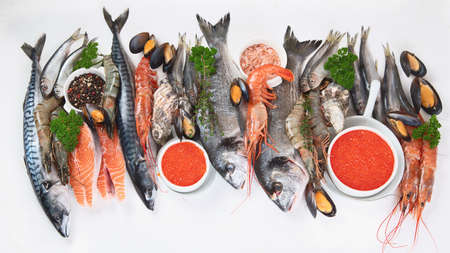 Fresh fish and seafood. Healthy diet eating concept. Top view