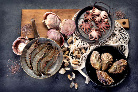 Fresh seafood arrangement on dark background. Mediterranean diet concept. Flat lay, top view