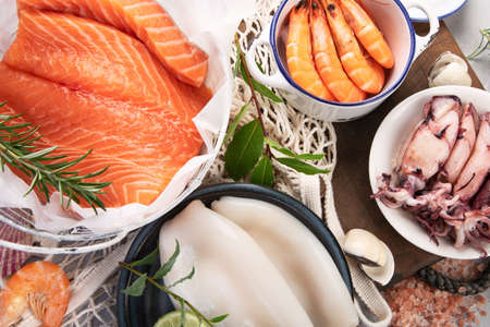 Fresh raw seafood. Healthy diet eating concept. Top view with copy space