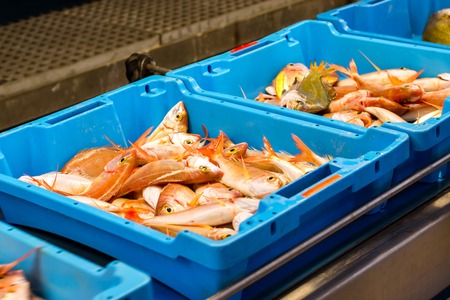 Blue plastic containers with catch of sea fish, ocean delicacies. Industrial catch of fresh fish. Fish auction for wholesalers and restaurants. Blanes Spain, Costa Brava. Summer fishing in port Blanes