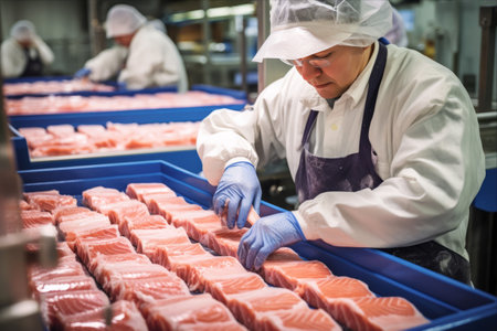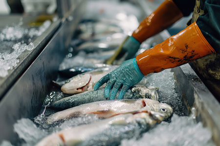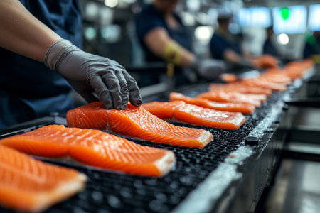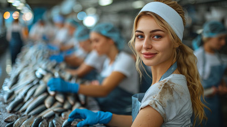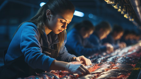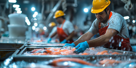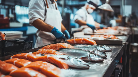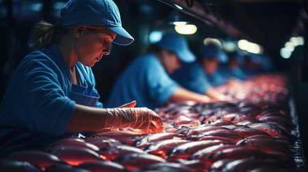 Workers in a seafood factory enhance quality by skillfully handling fresh fish, showcasing the intricate process of seafood preparation on a busy production line in an industrial setting.