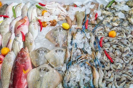 Fresh raw seafood on ice with herbs and spices at the fish market food