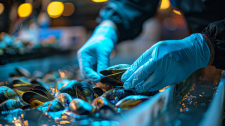 Hands Carefully Selecting Fresh Mussels at a Vibrant Seafood Market During Evening Hours in a Bustling City Environment. Generative AI