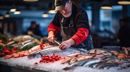 A cheerful fisherman skillfully handles fresh seafood at a vibrant local market full of life