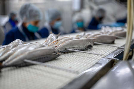 Modern fish processing plant conveyor belt with raw sea fish being processed into canned fish. Concept Fish Processing Plant, Conveyor Belt, Raw Sea Fish, Canned Fish, Modern Technology
