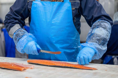 The process of manual filleting of red fish. The worker cuts the fish into pieces with a knife.