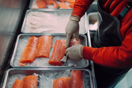 Fishmonger wearing gloves is filling fresh salmon on a bed of ice for display at a fish market