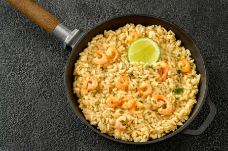 Italian risotto with shrimp on a black plate. Dark background, side view