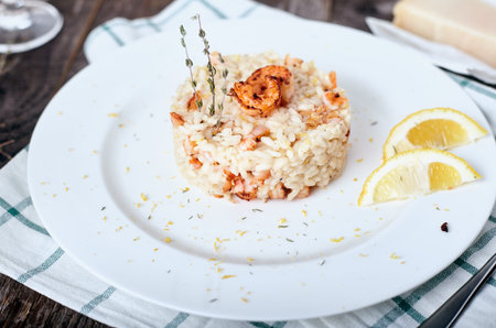 Risotto with shrimps, tomatoes and thyme. Italian food