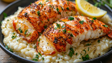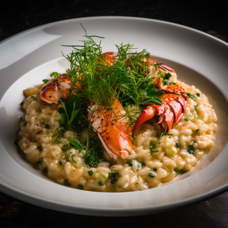 Lobster risotto close up. Delicious Lobster Risotto made from roasted lobster claws with parmesan and herbs, garnished with microgreens. Lobster restaurant dish. Sea food concept