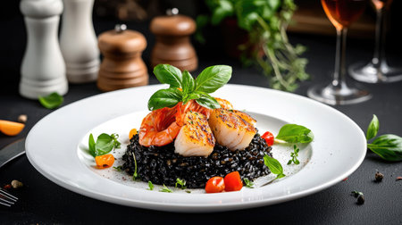 A stunning seafood dish featuring succulent shrimp and scallops served on a bed of black rice, garnished with fresh basil and cherry tomatoes for an elegant presentation.