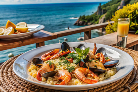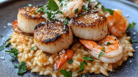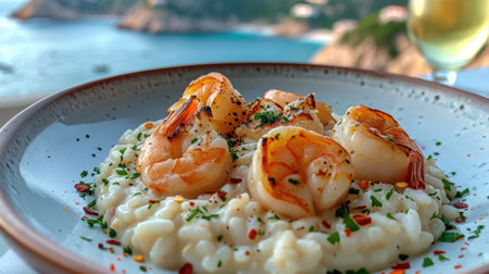 Elegant Seafood Risotto Unwind: Creamy Seafood Risotto Plate, Prawns, Scallops, Parsley Sprinkle, Fine Dining with Ocean View, Luxurious Feel