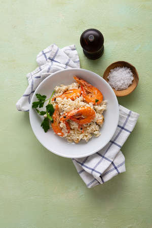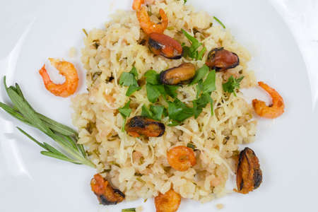 Risotto cooked in fish broth with seafood on a white dish, top view close-up