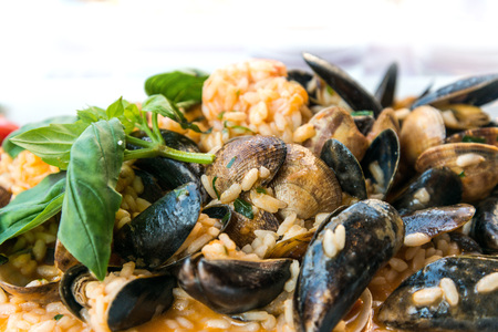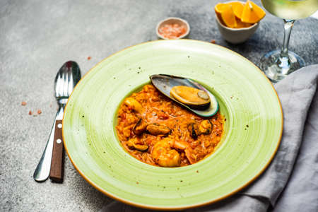 Mediterranean risotto with shrimps, mussels, octopus and clams. Seafood risotto. High quality photo