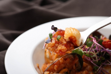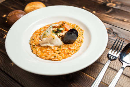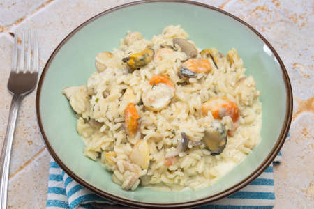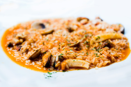 Seafood risotto with mussels, squidspus and mussels. Italian cuisine