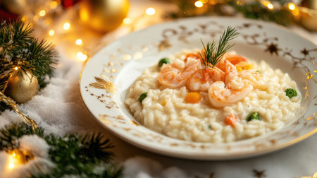 A stunning plate of creamy shrimp risotto garnished with fresh herbs, set against a festive holiday backdrop, perfect for winter celebrations.