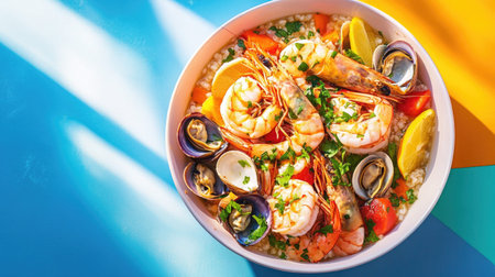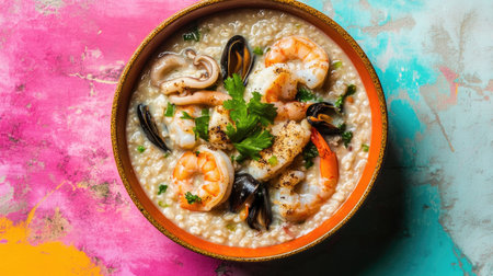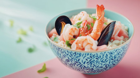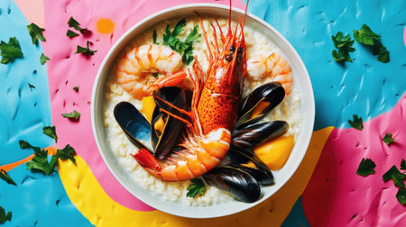 This vibrant seafood risotto features a rich arrangement of shrimp, clams, and fresh vegetables, served in a decorative bowl against a colorful backdrop.