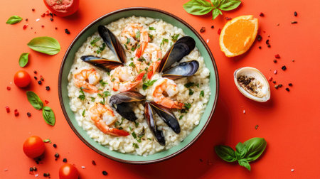 A beautifully arranged plate of seafood risotto featuring shrimp, mussels, and basil, set against an eye-catching orange background, ideal for food lovers.